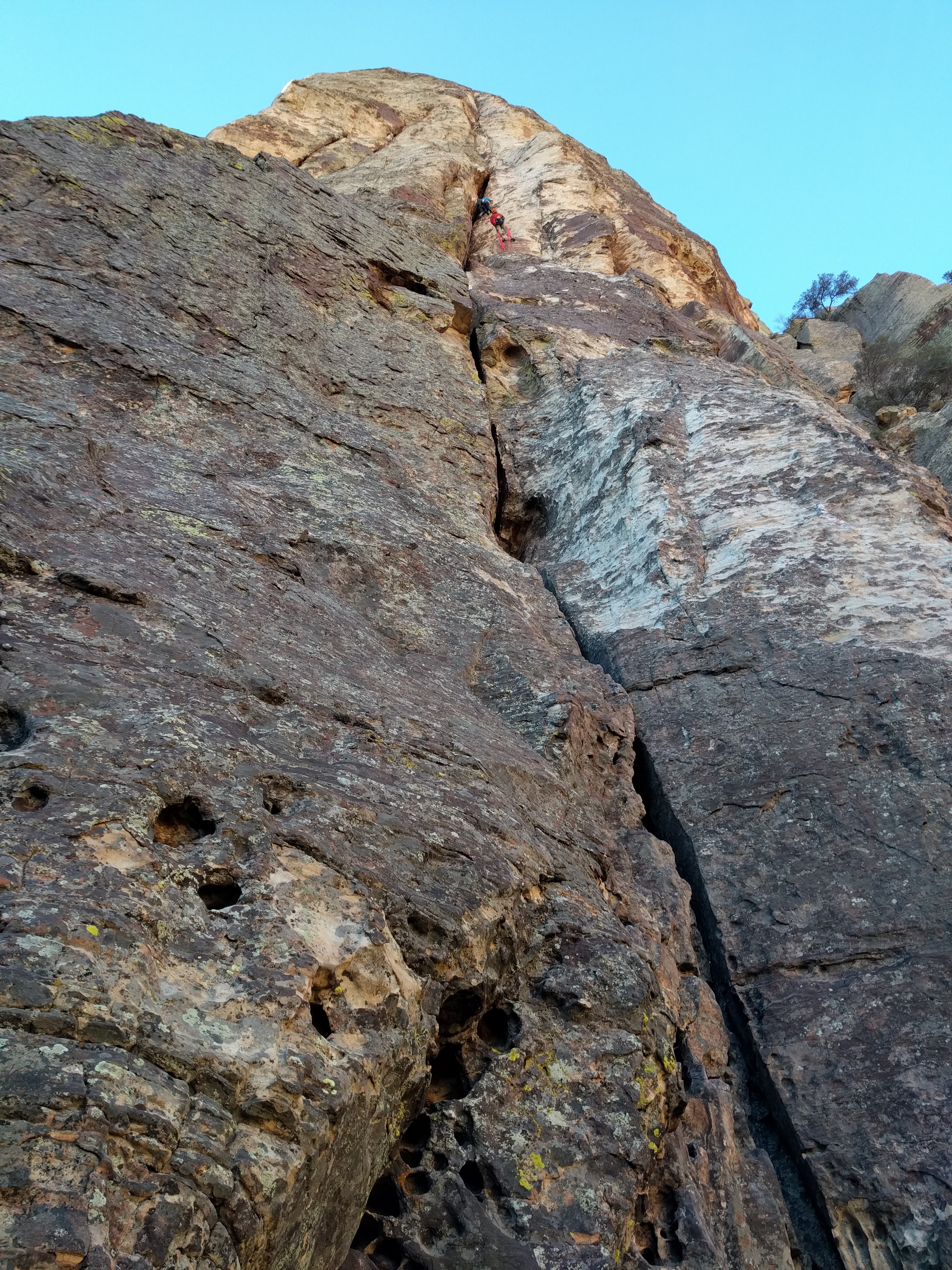 My friend K taught me how to make a basic anchor at the bolts using quick draws and clove hitches and to use my tube style device to belay him up. Awesome experience. While the pitches also had old pitons and newer bolts, there were also plenty of opportunities to place our own cams.